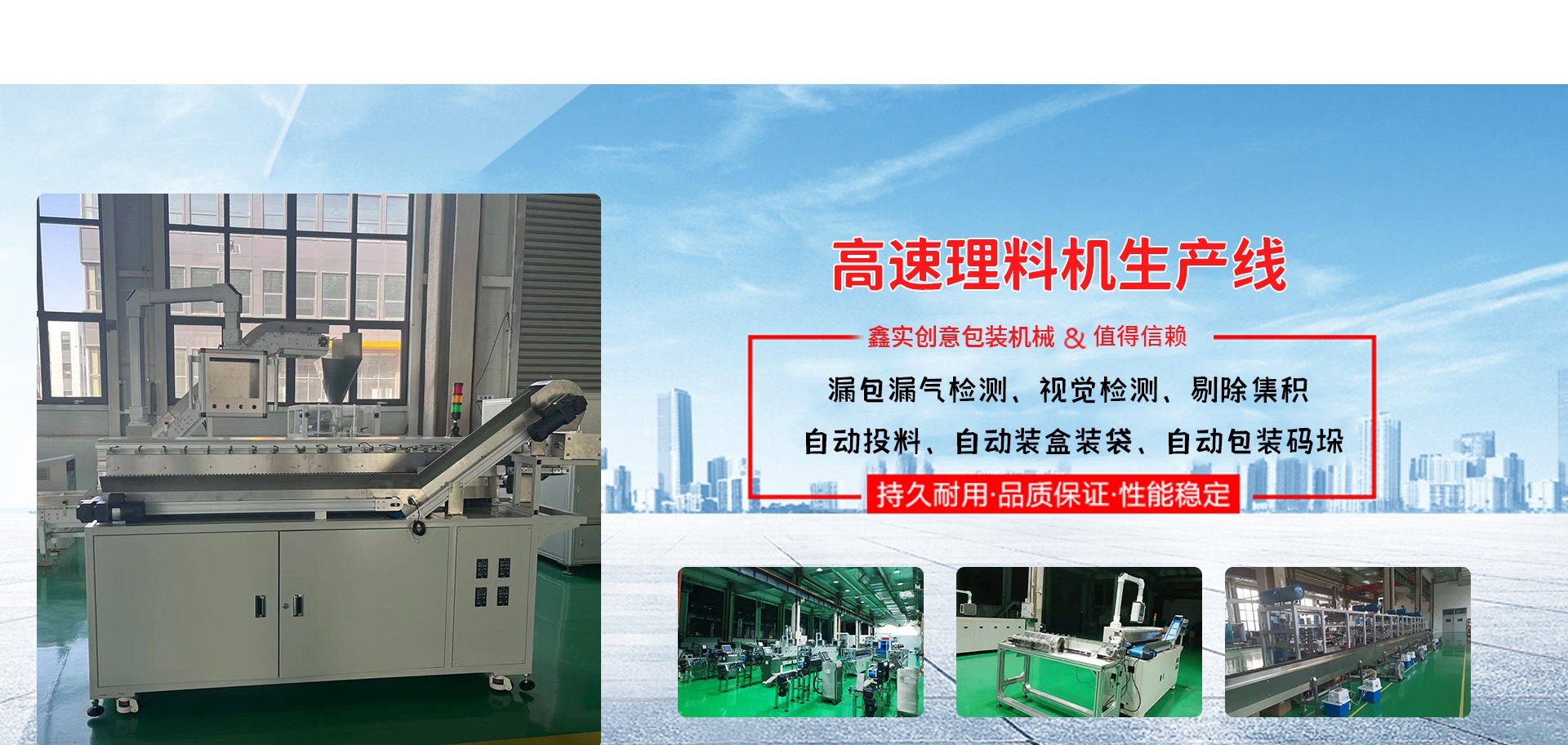 自主研發(fā)產(chǎn)品有食品行業(yè):食品包裝機(jī)、散包高速理料機(jī)、食品高速理料生產(chǎn)線、全自動管材包裝生產(chǎn)線、管材包裝設(shè)備、自動折盒機(jī)、高速裝盒機(jī)、高速投包機(jī)、高速散包自動上料機(jī)、高速包裝機(jī)移動式端封、立式枕式自動接膜機(jī)、包裝設(shè)備自動糾偏儀、打孔器、真空自動上料機(jī)、視覺檢測等多種自動化設(shè);建材行業(yè):直管包裝生產(chǎn)線、蓋帽機(jī)、飛行檢測儀等;公司業(yè)務(wù)范圍涵蓋建材、食品、醫(yī)療多個行業(yè),客戶遍及上海、天津、浙江、江蘇、山東、河南、四川、廣西等地。
